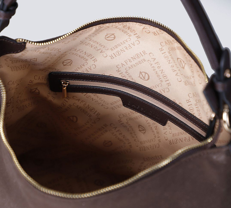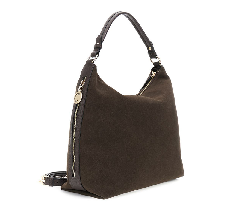 Μαλακή τσάντα με εφέ σουέτ, φερμουάρ και μεταλλικά γράμματα. Αφαιρούμενο λουράκι ώμου και εκλεπτυσμένη εμφάνιση για καθημερινά ρούχα με μποέμ κομψή πινελιά.